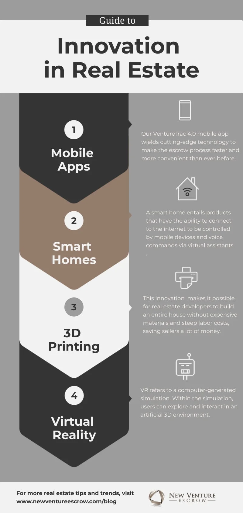 New Venture Escrow is always looking into how innovation in real estate has evolved and what it means for the future of the industry. Have your finger on the pulse of the latest real estate trends and news by staying up to date with our blog.